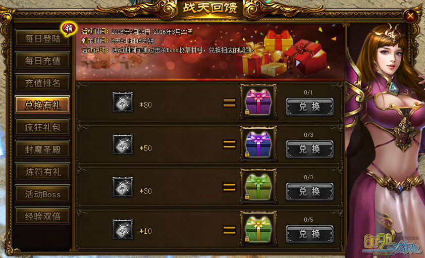 活动内容:活动期间可通过击杀BOSS收集材料,兑换相应的奖励内容!兑换次数每天重置!