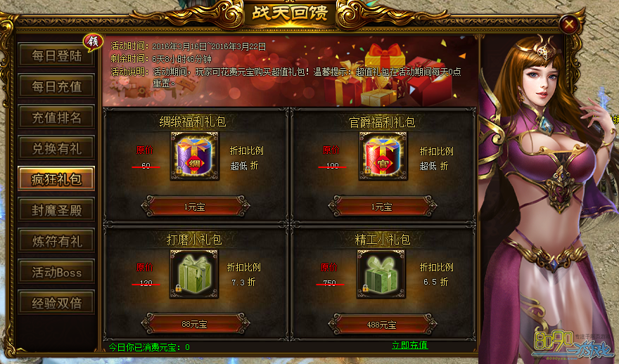 活动内容:活动期间,大量超值礼包可超折扣价格购买,每天0点重置购买次数!