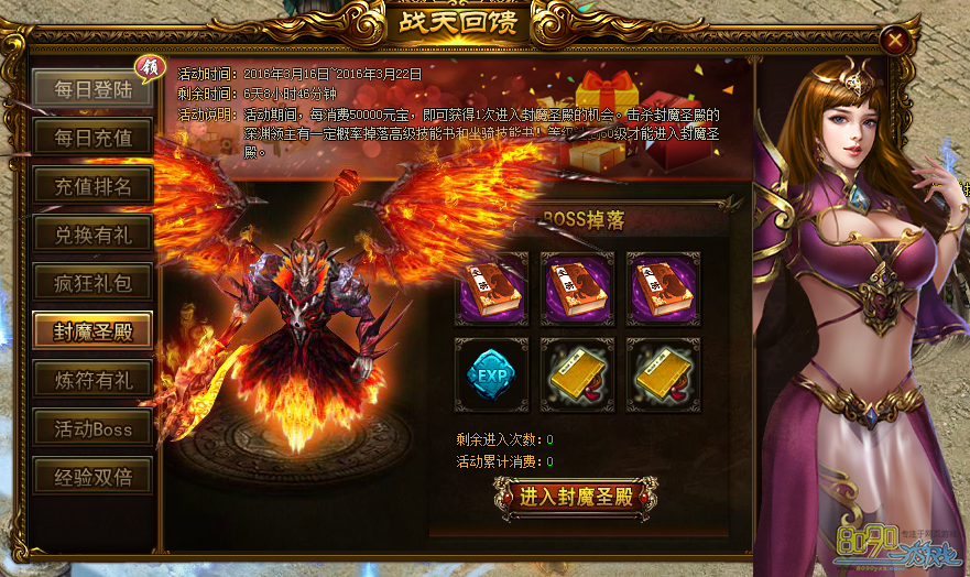 活动内容:活动期间,每消费50000元宝,即可获得1次进入封魔圣殿的机会,击杀封魔圣殿的深渊领主有一定几率获得高级技能书和坐骑技能书。