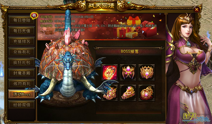 活动内容:活动期间每天12:45和18:45在沙漠土城(176,131)处刷出活动BOSS以及小怪,将其击杀可获得丰富奖励!