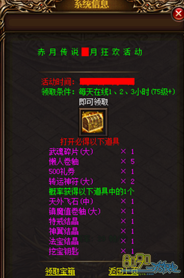 【活动内容】活动期间,等级75级以上玩家每天在线1、2、3小时即可领取狂欢宝箱
