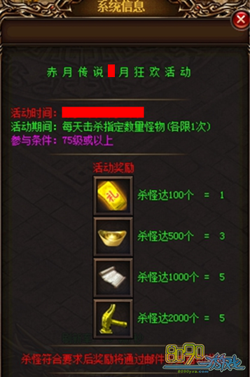 【活动内容】活动期间,每天75级或以上玩家击杀指定数量的怪物可获得大量奖励(各限1次)