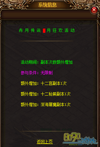 【活动内容】活动期间,十二宫、十二秘殿、深海屠魔副本增加1次