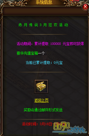 【活动内容】活动期间每天累计充值10w元宝即可获得豪华宝箱一个