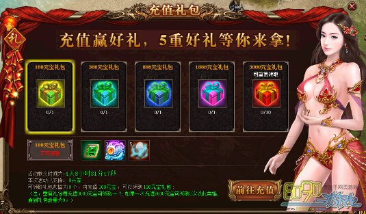 活动详情:活动期间充值达到指定元宝数,即可领取一份对应充值礼包,3000元宝礼包更可重复充值领取10次,每充值3000元宝可领取一个,直到礼包数为0为止。