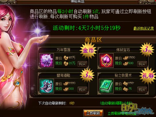 活动详情:活动期间,玩家可通过立即刷新按钮进行刷新,可进行购买低价物品。
