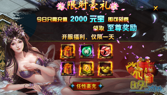 活动内容:玩家只要充值2000元宝就能领取疯狂的超值奖励。