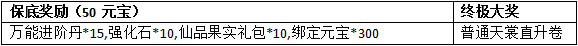 活动奖励:花千骨画卷、幻化御剑:天玑云掌、10级宝石、顶级技能书、完美强化石、套装提品石等