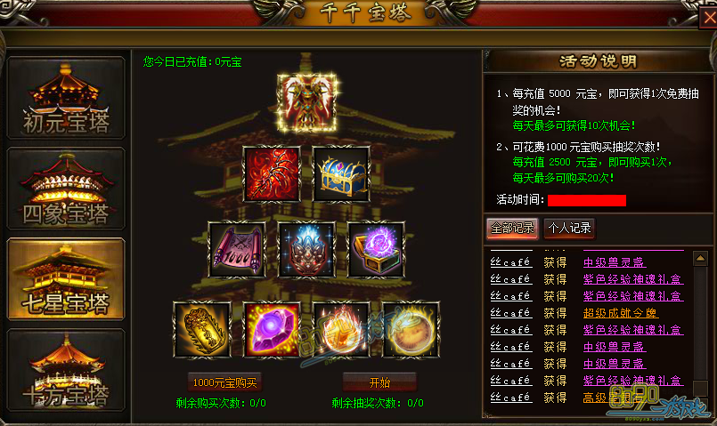 2、可花费2000元宝购买抽奖次数! 每充值5000元宝,即可购买1次,每天最多可购买20次!