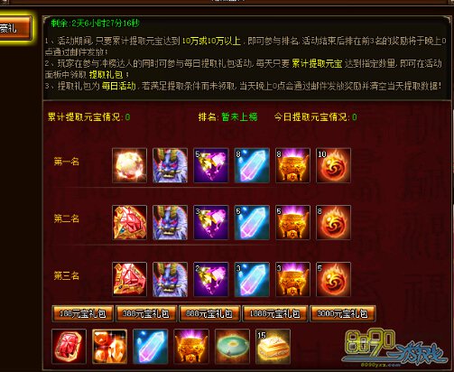 b) 活动期间,玩家每天累计提取元宝达到188、388、888、1888、3000即可在面板领取相应的每日充值礼包,礼包每日重置,当天没有领取的奖励第二天零点时以邮件补发。