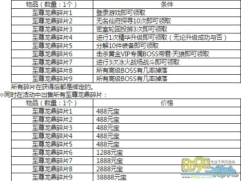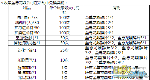 活动内容:活动期间,玩家可通过完成一系列的目标获得对应的至尊龙鼎碎片,获得碎片后玩家可在此活动中兑换各种奖励。