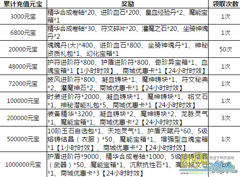 活动内容:活动期间内,玩家每日累计充值元宝数达到指定金额即可领取奖励。