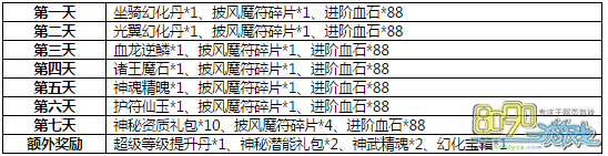 活动内容:活动期间内,每日充值1000元宝即可领取奖励,最后1天需要单笔充值10000元宝才可领取。连续7天达到指定充值金额还可领取额外奖励。