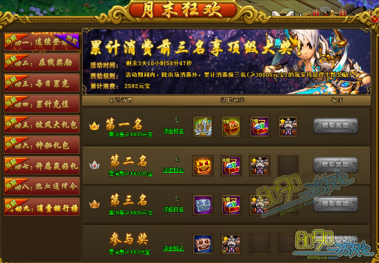 活动规则:活动期间内,除市场消费外,累计消费前三名(≥30000元宝)的玩家将获得丰厚奖励