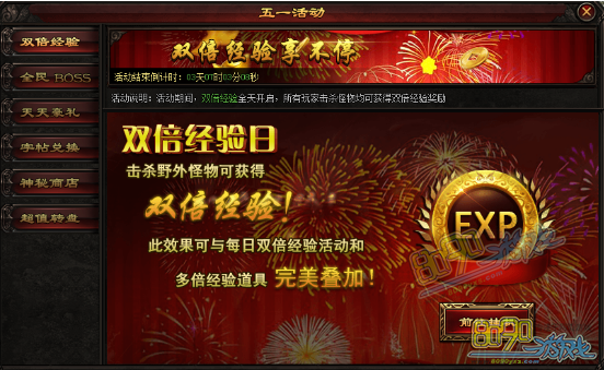 活动内容:活动期间,双倍经验全天开启,所有玩家击杀怪物均可获得双倍经验奖励,效果可与每日双倍经验或者和多倍经验道具完美叠加!