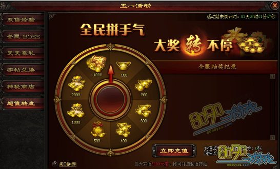 活动内容:活动期间,玩家每天充值5000元宝即可开启转盘,转动转盘可获得元宝奖励,并有几率抽到大奖!