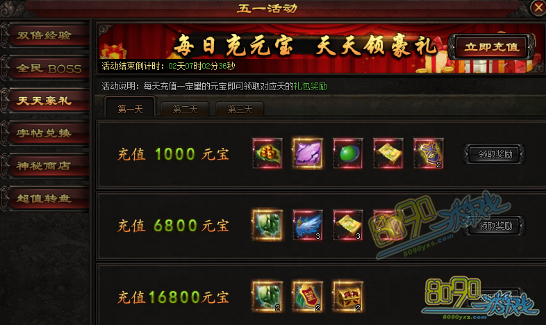 活动内容:活动期间,每日充值一定元宝即可领取对应的礼包奖励。