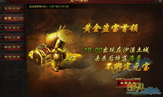 活动时间:活动期间的每天晚上19:00,黄金盗宝首领将出现在沙漠土城,击杀后将掉落海量不绑定元宝!