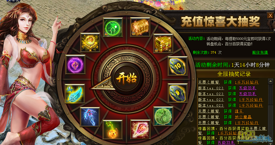 【活动内容】:活动期间,每提取5000元宝可获得1次抽奖机会,百分百中奖!可获得南瓜灯(幻武)、亡灵追魂(幻武)、上古装备箱、10级黑铁等大量奖励哦!