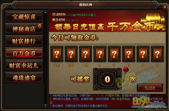 活动详情:活动期间充值领取每日充值5档奖励,分别可获得4、1、1、1、1次摇杆次数,摇杆的次数会从低到高显示,每日充值的档次后面一档都会高出前面10倍金币收益,如果一天5档的领完就可获得当天金币的最大收益,获得的金币将在每日0点通过邮件的方式发送给玩家。