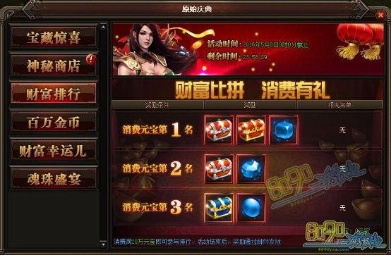 活动详情:活动期间消费满20W元宝就可以参与排行,活动结束后奖励会已邮件的方式发放给玩家,一定要记得提取~