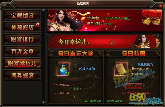 活动详情:活动期间每天0-21点可以购买特惠礼包,每服限量100个,购买特惠礼包可以获得1-100的幸运数字,数字不会重复,每天的21:00系统会随机抽取一个幸运数字,中奖的玩家将会获得该日的幸运大奖,奖品会通过邮件的方式发放给玩家
