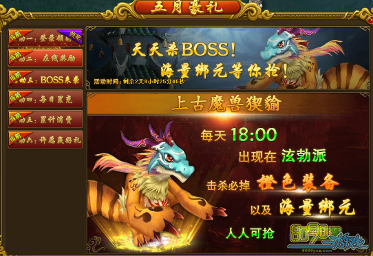 活动规则:活动期间,上古魔兽猰貐每天晚间18:00会出现在1线泫勃派,击杀BOSS即可掉落橙色装备、海量绑元、许愿星和许愿字,人人可抢。