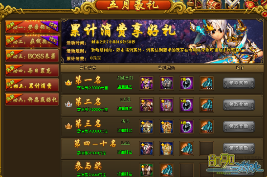 消费排行榜第三名(消费≥20000元宝)可获得:4阶战甲碎片*1,4阶内甲碎片*1,5级武攻黑曜石*1,披风灵缎*100;