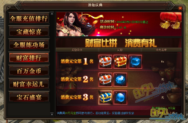 活动详情:活动期间消费满20W元宝就可以参与排行,活动结束后奖励会已邮件的方式发放给玩家,一定要记得提取~