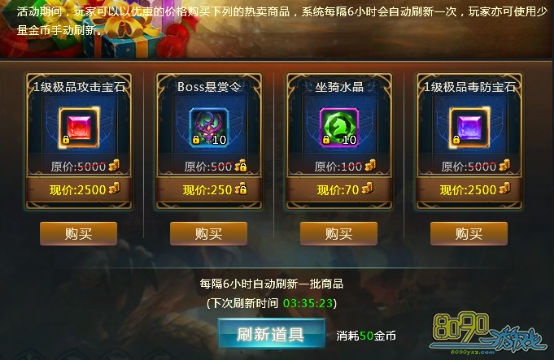 五、 限时折扣商店,活动期间,每隔6小时可刷新一次,可使用超低价格购买超值宝石、坐骑水晶道具等稀缺物品