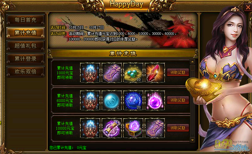 活动期间,累计充值元宝达到1000、6000、10000、30000、60000、100000、200000即可获得对应的丰厚奖励!