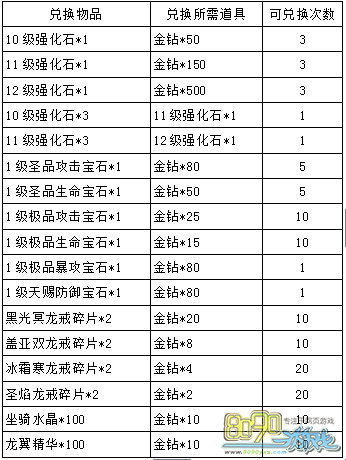 200000金币:金钻*400、1级极品暴攻宝石*1、12级强化石*1、龙戒精炼伤害石*60、龙戒精炼防御石*60
