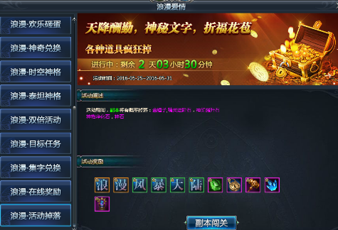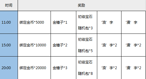 【活动内容】:野外挂机,将有概率获得道具:浪、漫、风、暴、大、陆,兑换即可得到精灵进阶石、金锤子和浪漫风暴礼包!