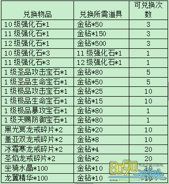20000金币:金钻*40、宝石经验*200、9级强化石*1、圣焰龙戒碎片*16、冰霜寒龙戒碎片*16