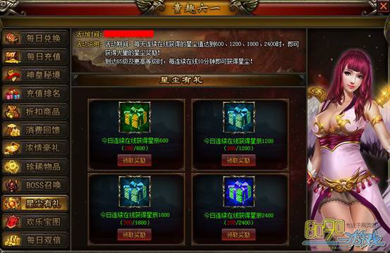 【活动说明】:活动期间,每天连续在线获得的星尘值达到600、1200、1800、2400时,即可获得大量的星尘奖励!到达65级及更高等级时,每连续在线10分钟即可获得星尘!