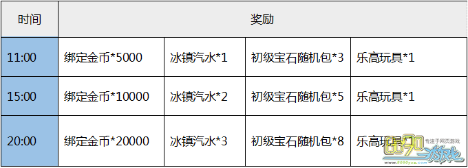 玩家当天命格经验达到140,额外赠送奖励:精灵进阶石*10,冰镇汽水 *10,绑定初级宝石随机礼包*15,神印提升石*10,乐高玩具*2
