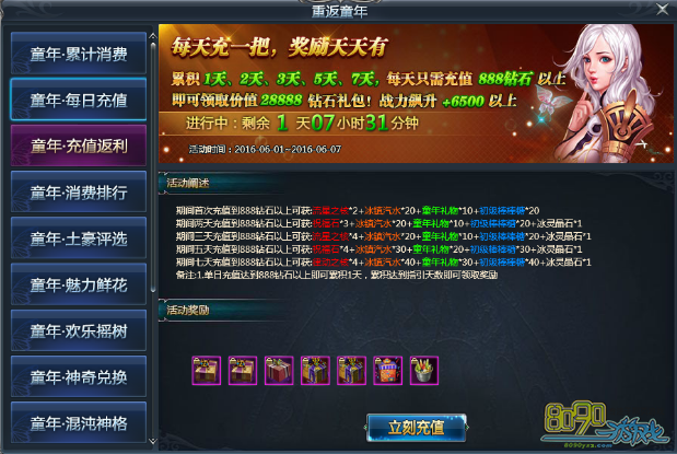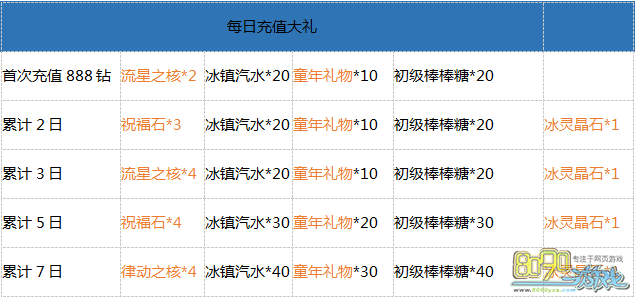 备注:1.单日充值达到888钻石以上即可累积1天,累积达到指引天数即可领取奖励