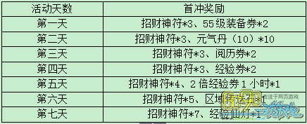 活动内容:活动期间每日充值任意金额即可领取天天首冲礼包一份