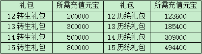 活动内容:活动期间玩家只需充值对应元宝金额即可领取对应转生礼包