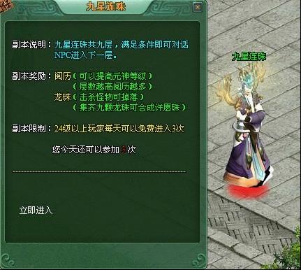 首先我们可以在王城87,120处找到九星连珠NPC,然后就可以点击进入了。每天玩家有3次免费进入的机会。不过需要玩家达到24级以上才能进入九星连珠哦。