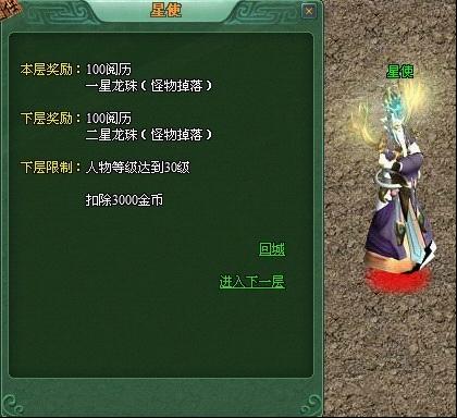 可以看到每一层都会有阅历和龙珠的奖励。而且每下一层对玩家的等级和支付的金币也有要求。因为每一层的BOSS实力都非同小可,所以为了玩家们的安全还是限制了等级。