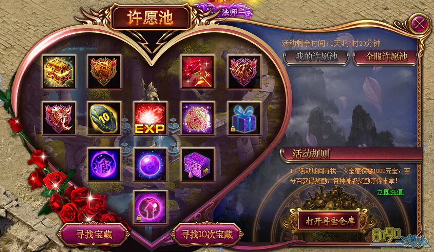 【活动内容】:活动期间,每花费1000元宝可进行一次许愿,每次必定获得道具,有几率获得七夕时装箱、玄武器灵令牌、迅豹器灵令牌、猛犸器灵令牌、水晶之恋、海量经验丹(10亿)10级黑铁等大量珍稀道具!