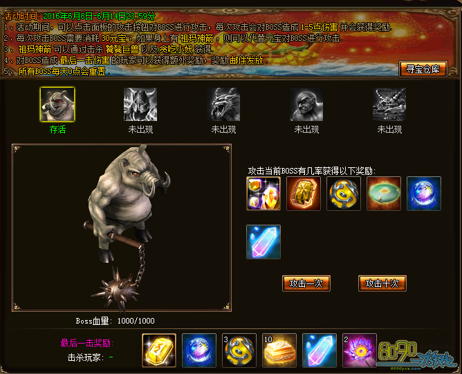 活动期间,可以点击面板的攻击按钮对面板指定BOSS进行攻击,每次攻击会对BOSS造成1-5点伤害,每次攻击BOSS需要消耗祖玛神箭道具,道具不足时可30元宝代替,每次对BOSS进行攻击都会获得随机道具奖励,奖励发放到寻宝仓库,可一键攻击十次。对BOSS造成最后一击伤害的玩家可以获得对应BOSS的额外奖励,奖励以邮件发放。所有BOSS每天0点重置血量。祖玛神箭可以通过击杀活动怪物饕餮巨兽及贪吃小妖获得。