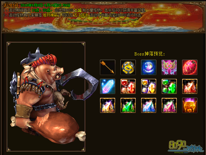 活动期间每天13点、22点会在土城刷出BOSS饕餮巨兽及数个贪吃小妖,击杀后能获得祖玛神箭等丰富奖励。