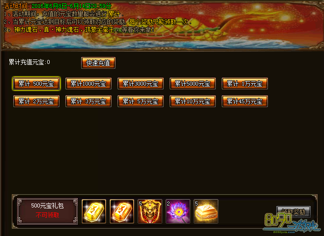 活动期间,累计提取元宝达到指定数量后即可领取对应的累计提取礼包,每个累计提取礼包只能领取一次,提取元宝越多礼包奖励越丰富,活动结束后满足条件未领取的礼包会以邮件补发。