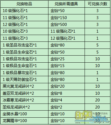 200000金币:金钻*400、1级天域防御宝石*1、12级强化石*1、盖亚双龙戒碎片*8、黑光冥龙戒碎片*8