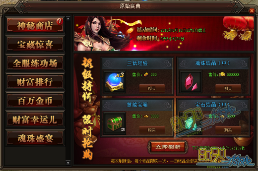 活动详情:神秘商店又来了哦,小伙伴们可以已使用金币、礼金、元宝在神秘商店内购买所需道具,只要399元宝就可以进行刷新,每样只能购买一次,如果这一页的购买完了可以免费刷新一次。