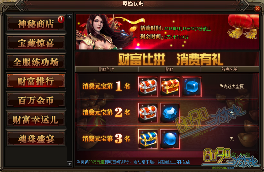 活动详情:动期间消费满20W元宝就可以参与排行,活动结束后奖励会已邮件的方式发放给玩家,一定要记得提取~