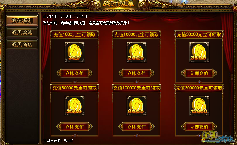 活动内容:活动期间每充值一定元宝可免费领取战天币!
