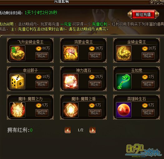 活动详情:活动期间,玩家每充值一元宝可获得一个充值红利,红利可用于购买活动中的丰富道具商品。注意:充值红利在活动结束后清零,请在活动期间内消费完哦。